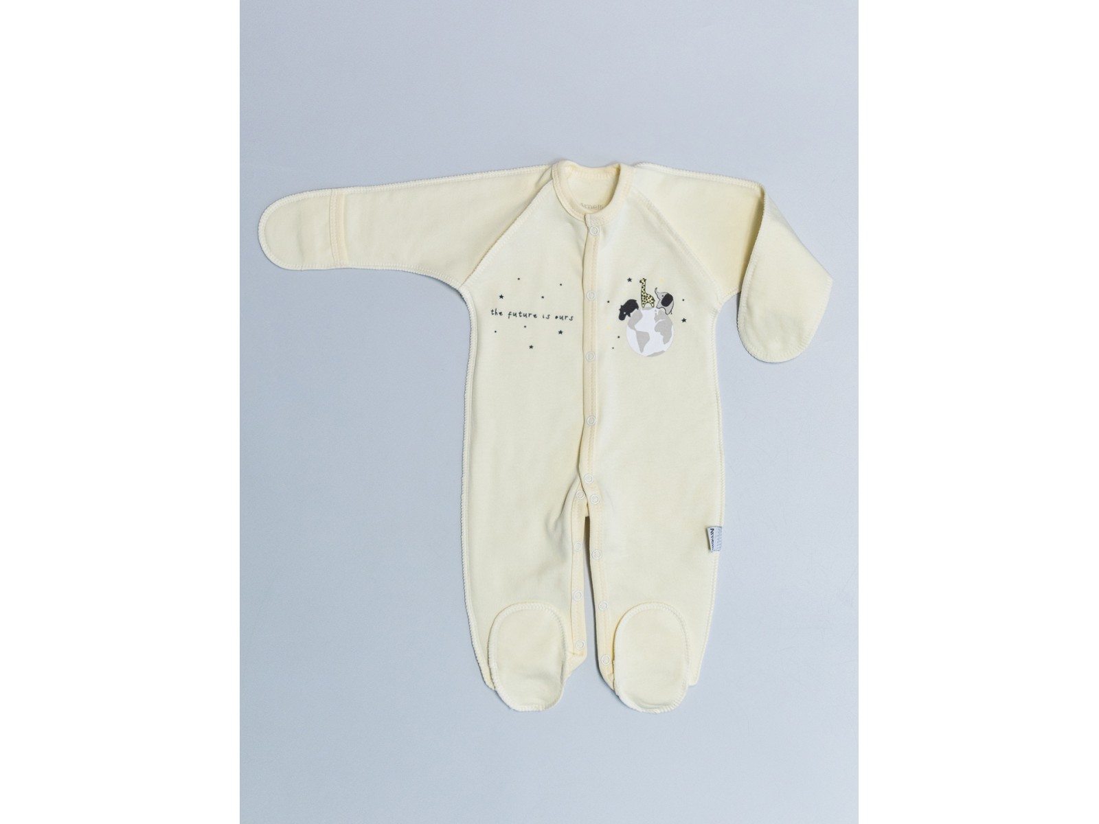 Комбинезон полотно футер, размер 56-62, швы наружу, рукава реглан с царапками, бейка по контуру, полочки и ножки распашные на кнопках, на полочке принт.